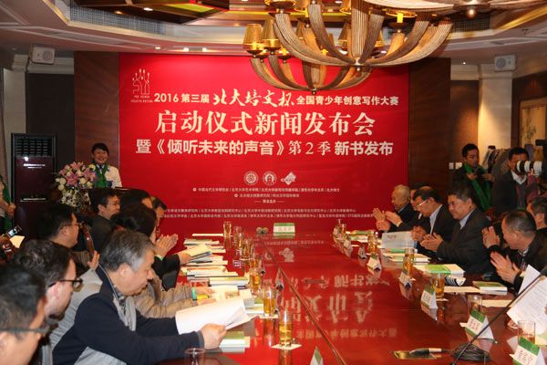 窗外大雪纷飞,室内春意盎然。2015年11月22日,2016第三届“北大培文杯”全国青少年创意写作大赛启动仪式暨大赛优秀作品集《倾听未来的声音》(第2季)新书发布会在北京大学隆重举行,为新一轮的青春创意写作热潮点火助势。